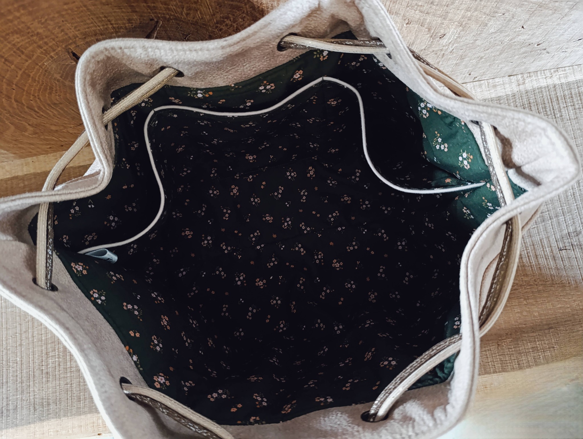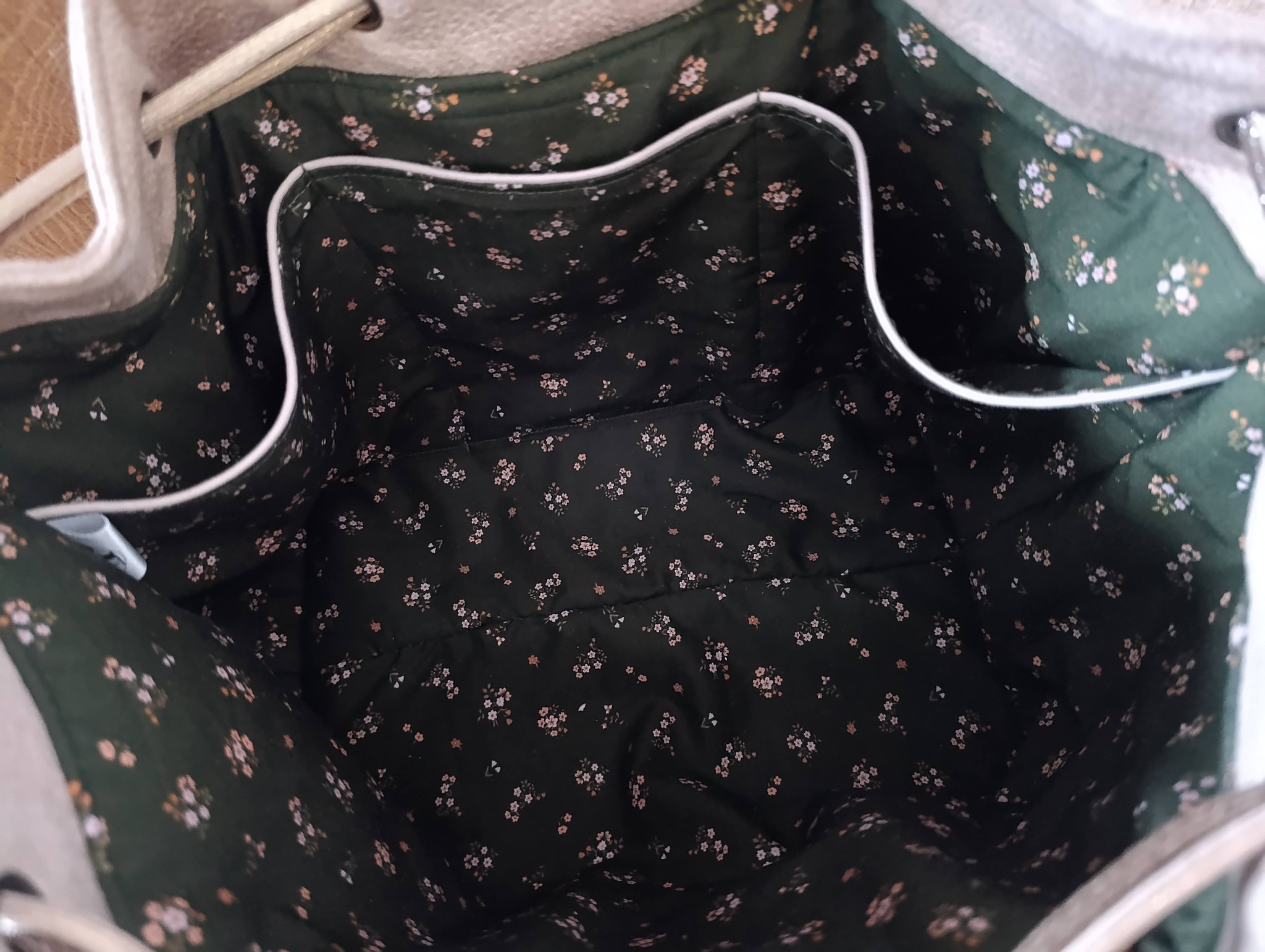 En simili cuir crème (15% de cuir et 85% polyester), doublé imprimé kaki et molletonné.